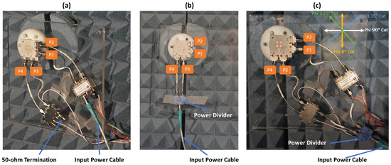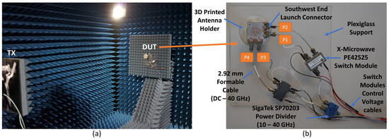 A simple measurement mechanism with a reduced number of controllers is used for measuring the ten (10) switched beams of the proposed antenna system. In Figure 9b, the antenna setup and the feeding network components are shown. To fix the antenna inside the Anechoic Chamber, an antenna holder was designed and printed using a 3D printer. In addition, a transparent plexiglass support was produced and fixed with the antenna holder to hold the feeding network components. SigaTek SP70203 power divider is used as the first component of the feeding network, and it operates from 10 GHz to 40 GHz, which covers the targeted 5G frequency band of the proposed antenna system. The outputs of the power divider are connected to two in-phase high frequency 2.92 mm 3-inch formable cables from Centric RF that operate up to 40 GHz. Two X-Microwave switch modules fed by the power divider are used to switch the coming signal between the antenna coupler ports. Each of the switch modules has an UltraCMOS SPDT RF switch (PE42525) from Peregrine Semiconductor. The switch chip operates from 9 kHz to 60 GHz, and at 50 GHz, it exhibits 1.9 dB insertion loss and 37 dB isolation which makes it a suitable choice for the proposed antenna measurements at 5G frequency bands [29]. Two in-phase 4-inch 2.92 formable cables are used to connect each switch module to antenna coupler ports (P1, P2, P3, and P4) as depicted in Figure 9b. The switching mechanism of those modules is controlled via voltage control cables by applying different voltage levels to each switch.