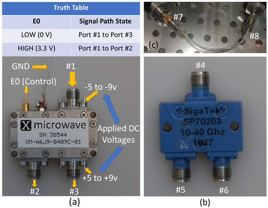 A detailed view of the switch module, power divider, and 4-inch formable cable is shown in Figure 10. The switch module needs two input DC voltages that can be applied to the DC pins of the module. The whole module outer case is ground, and it is connected to one ground cable as shown in Figure 10a. The working principle of the switch module is explained by the truth table shown in the figure. The input power cable will be connected to port 1 and then according to the voltage level applied to E0 (Control) pin, the input signal will be switched either to port 2 or to port 3. When 0 V is applied to E0, the input signal will switch from port 1 to port 3, and port 2 will be the isolated port. When 3.3 V is applied to E0, the input signal switch to port 2 and port 3 will be the isolated port.