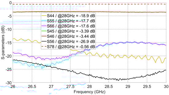 In Figure 12, measured S-parameters of the power divider and the formable cable are shown. Within the targeted 5G frequency band, the power divider has a measured 3.4 dB power division ( and ), by which 0.4 dB is coming from power divider insertion loss. All reflection coefficients (, , and ) are less than −10 dB. The isolation between ports 5 and 6 () is better than 20 dB from 26 GHz to 30 GHz. The measured insertion loss of the cable () is around 0.56 dB. The insertion losses of all feed network components will be added to the measured gain values of the switched beams to get the real radiation patterns’ gain of the proposed antenna shown in Figure 4.