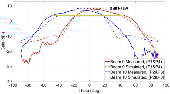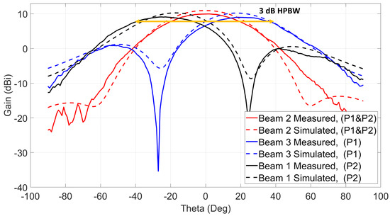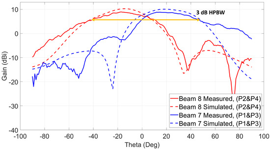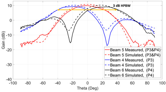 Beam 1 is shifted to = −26 with maximum measured gain equal to 9.1 dBi, and beam 3 is shifted to the other side and has a maximum gain of 8.9 dBi at = 26. The measured losses shown before for the switch modules and the centric RF coaxial cables are de-embedded from the measured gains to know the real radiation patterns’ gain of the antenna system under test. Similarly, the second switch is used to excite ports 3 and 4 to generate beams 4 and 6. Those beams are measured across cut Phi 90 with 9.1 dBi maximum measured gain at = −25 for beam 4 and 9.1 dBi gain at = 25 for beam 6 as shown in Figure 15. The simulated radiation patterns are plotted on top of the measured patterns, and they show a good agreement with at most 1 dBi difference between them.
