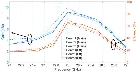 Figure 18 shows the measured cross-polarization levels for the ten (10) switched beams. Taking into account 90 3-dB HPBW and the average measured gain for all beams as 8.9 dBi, the maximum cross-polarization level is −5 dBi and the minimum cross-polarization level is −30 dBi, and these will correspond to the co/cross-polarization ratio of 14 dB and 39 dB, respectively. These low cross-polarization levels are due to the high inter-port isolations (shown in Figure 6) between the dual-polarized ports. In order to investigate the performance of the radiation patterns vs. frequency, the maximum measured gains for beams 1, 2, and 3 are recorded at multiple frequencies from 27 GHz to 29 GHz as shown in Figure 19. Add to that, the efficiency for each beam vs. frequency is calculated. The efficiency is calculated using simulated directivity values of those beams at each frequency with measured realized gain at each frequency. As shown in the figure, the measured gains and calculated efficiencies for those beams reaches maximum at 28 GHz and drops when moving away from the resonance frequency (28 GHz) of the 2 × 2 series fed antenna array. This is caused by the narrow radiation bandwidth of the regular microstrip patch antenna that is used as an array element to build the antenna array. Despite the fact that the antenna system reached wide 10 dB impedance bandwidth (as shown in Figure 5), the antenna gain vs. frequency is limited by the narrow band microstrip patch antenna. The other seven (7) switched beams will behave in a similar way vs. frequency.
