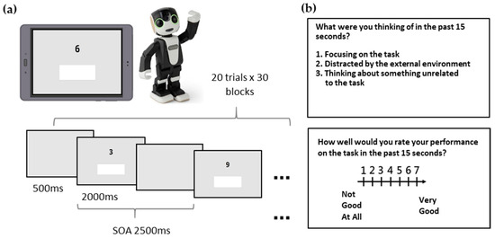 The paradigm of the modified SART. The example image in (a) shows the task presented on a tablet beside a RoBoHon robot. The participants were instructed to press the white response button as soon as possible each time a Go-stimulus was presented, if what was presented was a NO-GO target, the participants were required to withhold the button pressing response. (b) Illustrates the two probe questions that appeared at the end of each error block whenever any response error had been detected.