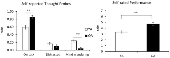 Age differences in self-aware attentiveness and performance. Results are shown separately for self-reported thought probes and performance. The frequency of reporting on-task and being MW significantly differed among age groups. In terms of self-rated performance, older adults tended to rate higher about their performance. Error bars represent one standard error from the mean. ** p < 0.01.