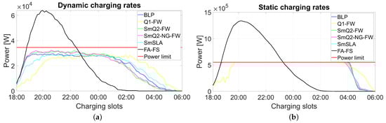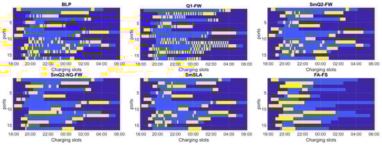 Figure 2 and Figure 4 also show that SmQ2-FW, SmQ2-NG-FW, and SmSLA better satisfy the rule of early charging than BLP and Q1-FW. Obviously, FA-FS is the best in this category; however, it is disqualified due to the power limit criterion (as discussed above). This rule is enforced by the matrix in (12), (13), and (16), and it aims to enforce charging as early as possible. Obviously, the similar rule is incorporated in (11) via vector w but BLP seems to tackle worse in this aspect, as demonstrated in Figure 2 and Figure 4.
