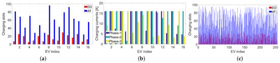 Experiments were conducted for a variety of scheduling problems. Figure 3a,c show that ED and AT parameters are highly diversified in a wide range of their possible values in our tests. This reflects the real charging scenarios. Moreover, the charging rates considerably change with time and phase lines. In practice, the charging currents can be different for each phase line in the same time slot. This case was considered in our simulations, as shown in Figure 3b.
