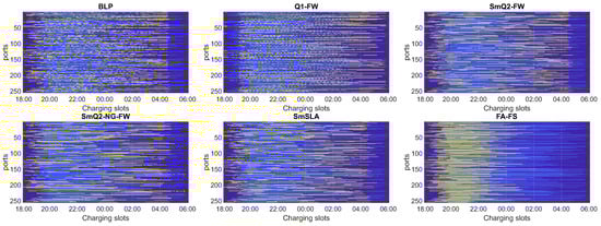 Another crucial criterion is the smoothness of the charging profile for each EV, which is related to the number of switching on/off operations at each charging station. The results presented in the tables demonstrate that SmQ2-NG-FW provides the smoothest charging profiles with a relatively low number of switching operations (parameter ). The worst results in this category were obtained by the BLP and Q1-FW. This observation can be justified by the fact that both BLP and Q1-FW do not involve any procedures for enforcing smoothness, whereas the others (excluding FA-FS) are based on the BQP strategy, where the quadratic term contains the smoothness penalty. Moreover, the quadratic II approach seems to be more favorable with respect to smoothness than the quadratic I approach. Furthermore, the results listed in the tables can be confirmed by the single-run charging matrices presented in Figure 2 and Figure 4. The charging profiles of SmQ2-NG-FW are the smoothest, but SmQ2-FW and SmSLA are only slightly worse, which is in favor of the latter considering all the criteria.