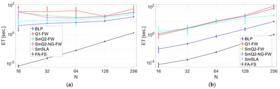 The algorithms were evaluated with respect to the computational complexity expressed by the ET criterion. In this category, BLP is substantially faster than the others (excluding FA-FS) when a constant charging rate is applied (see Figure 6). For the random charging rates, the difference in ET was not very large. Interestingly, an increase in the number of EVs scales linearly for BLP, and there is no simple relation between ET and N for Q1-FW, SmQ2-FW, and SmQ2-NG-FW. This is probably owing to the high computational cost of processing a much more complicated polytop determined by (23) when random charging rates are used. For , Q1-FW, SmQ2-FW, SmQ2-NG-FW, and SmSLA have approximately similar ET values for random and constant charging rates. BLP is much faster for each scenario and provides satisfactory results for meeting the constraints. Hence, it can be used in the precomputing stage to check if a feasible solution exists, given the input data.