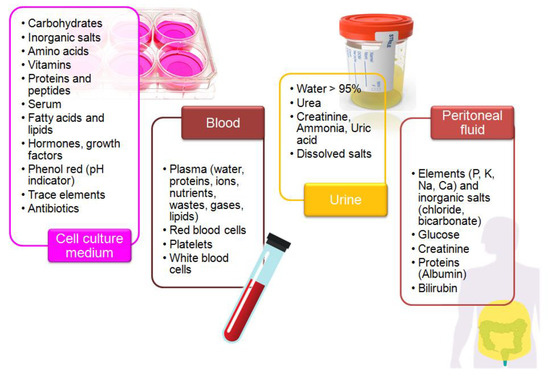 Biological samples are complex media because they contain extra organic and inorganic components, along with the presence of trace amounts of a target molecule [92]. Furthermore, their composition strongly differs and depends on the sample type (Figure 2). Overlapping signals from electro-active compounds that have relatively close oxidation potentials pose one of the major problems during electrochemical analysis of a real sample. The careful selection of the electrode support and measurement conditions allows for improvement of selectivity and sensitivity of electrochemical measurements [32,42]. Regarding the electrochemical determination of KP metabolites, special attention should be paid to the following issues: