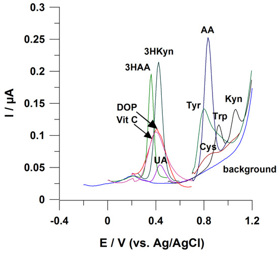 Possible interference in the case of voltammetric determination of KP metabolites. Working electrode: BDDE modified with Bi film; supporting electrolyte: 0.25 M mixture of CH3COONH4 with CH3COOH (pH 6.5), 0.04 M potassium sodium tartrate, and 0.5 µM Bi(III); registration technique: DPV (for details, see [42]). Concentration of analytes: 3HKyn 10 µM, 3HAA 2 µM, ascorbic acid (Vit C) 50 µM, dopamine (DOP) 20 µM, and uric acid (UA) 2 µM; tyrosine (Tyr) 20 µM, cysteine (Cys) 10 µM, tryptophan (Trp) 2 µM, kynurenine 2 µM, and anthranilic acid (AA) 10 µM.