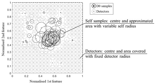 It is evident that the self-radius is critical for the performance of the classification, especially for non-linear sample sets. A small radius can increase the false alarm rate (detectors might fall in the holes within the self-samples), whereas a big radius decreases the detection rate (the approximate self-space is larger than the actual, including portions of non-self-space). In general, the definition of the radius is related to the problem of boundary invasion (approximate self-space invading the non-self-space and/or detector set invading the self-space). However, in most of the NSAs, this is a constant value whose definition is not properly addressed. Only a few authors faced the self-representation by using a variable self-radius, according to the statistics of the sample distribution. This allows us not only to provide a better approximation of the self-space but also to reduce the number of samples required and their overlapping. In Figure 1, an example of two-dimensional feature space, where the self-samples with variable radius, are used to censor the detectors by rejecting the ones that match with the approximate self-space. New samples falling within the portion uncovered by the detector circles are not detected, thus, the system is classified as undamaged.