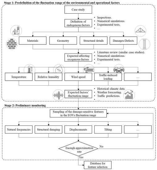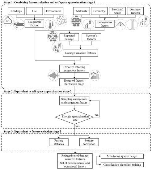 As previously mentioned, the feature selection strategy aims at the identification of the most representative features to be monitored based on the analysis of the self-region in the feature space, especially in terms of values distribution. Still, the real challenge is to perform this stage resorting to a reduced number of samples, in order to decrease the computational load and, most importantly, the time and costs associated with the acquisition. To be successful, this reduced baseline must be an unbiased sample set closely indicative of the feature value distributions, namely it must be representative of the feature fluctuations in the reference state, due to non-damage factors. Since various system’s features present daily and seasonal trends, in many geographical areas, a proper investigation to set baseline information would require at least a six-month time horizon; commonly, 18 months are recommended. Still, a continuous monitoring over this time frame is not necessary if a good approximation based on a reduced sample set is defined, with enormous advantages in terms of costs and data overload. In this regard, a set of self-approximation strategies are discussed hereafter. A generic flowchart is reported in Figure 3. Such strategies are usually divided in two stages. The former stage aims at the definition of the expected fluctuation range for the operational and environmental factors that are likely to affect most the system structural response in terms of damage-sensitive features. The latter stage consists of the preliminary monitoring of the damage-sensitive features under different values of the operational and environmental conditions that are representative of these factors’ values distributions.