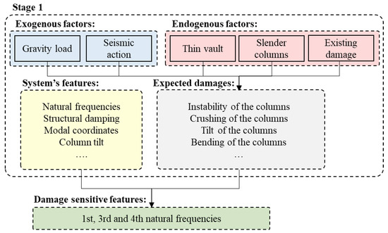 Feature selection for SHM is the process that aims at identifying the QoI, namely the system features to be monitored and the exogenous factors whose effect must be filtered out, to support damage detection. The strategy analysed in the present paper is composed of two stages, as depicted in Figure 2. A preliminary study is first performed to identify: (1) the endogenous factors, namely the sources of vulnerability of the system, its material and geometrical properties, and the aspects associated with its condition state (e.g., material defects, current damages, or evidence of previous damages); (2) the exogenous factors, such as hazards, peculiar operational conditions, loading, and environmental factors.