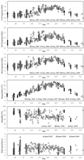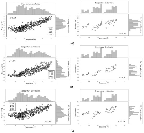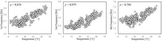 For the sake of brevity, only the correlation between frequencies and temperature is discussed here. Still, the same approach was followed to analyse the correlation between pairs of frequencies and between them and other environmental factors.