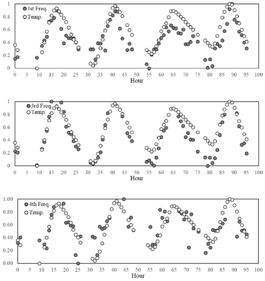 In the second stage, the features variation and their correlation with the environmental factors are investigated. The influence of the thermo-hygrometric parameters on the structural dynamic properties can be qualitatively evaluated by visualising the seasonal trends illustrated in Figure 6. As it can be observed, the trends of temperature and natural frequencies present clear similarities, although a higher dispersion for the frequency samples is noted as compared to the smooth variation featured by the temperature values. This is also evident by zooming in on the daily trend, as shown by the examples reported in Figure 7 where the features are normalised to the [0,1] interval defining the unitary feature space. Such a behaviour might be due to the influence of other exogenous factors on the frequency values, such as humidity and wind speed even though these parameters do not follow a clear seasonal trend (Figure 6).