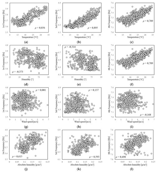 and its correlation with the frequency values is also investigated. This parameter has been used to analyse monitoring data from adobe historical buildings (e.g., [32,33]), whose dynamic response demonstrated to be strongly affected by humidity. However, for the present case study, the T-AH combination does not produce a better correlation (Figure 8j–l).