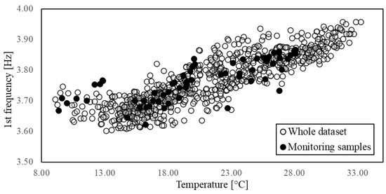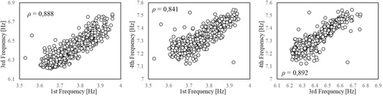 It is well-known that, if measured in distinct structural parts, environmental factors can present different variability ranges and time lags in their peaks due to the material characteristics and the local conditions and exposure of the different locations. This time lag can also interest the EOVs effect on the system vibrational properties [33,60,61]. Indeed, EOVs within a single element or among different elements are rather non-uniform and non-linear, especially in large-scale structures [12,35,62]. A recommended solution would be to perform the feature selection considering different measurement points and testing the correlation with properly averaged values. However, for the sake of simplicity, in the present study, only a single measurement point for the environmental factors is adopted, and two possible alternatives are considered. First, the degree of correlation between natural frequencies and temperature is estimated with a time shift of one hour, since the sampling rate of the measurements allows to consider only hourly lags, but this produces no further improvement in the Pearson coefficient (Figure 9). Then, the correlation is estimated only between frequencies. The pairwise comparison of these global dynamic properties shows that a very high correlation exists (Figure 10). A damage detection performed on a feature space composed of two natural frequencies might be even more effective, taking advantage of their different sensitivities to possible damage scenarios. However, such a feature space lacks the control on the exogenous factors’ variability, hence it is essential to sample the QoI for the training in order to guarantee the diversity of the environmental conditions.