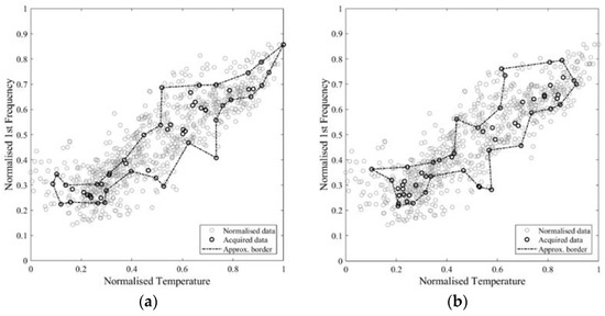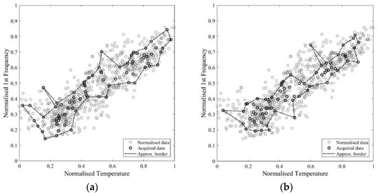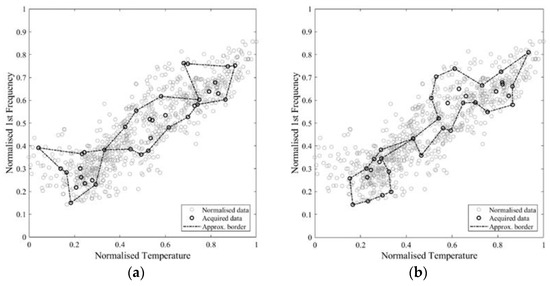 To analyse the performance of the approximation, it is assumed that the full self-space corresponds to the area enclosed by the enveloping boundary of the whole measured dataset (788 records). In real situations, no a priori information regarding the frequency bounds is usually available. It is also assumed that the temperature is the main exogenous factor that affects the system behaviour in the reference condition. Data provided by the climate archive for Lisbon (e.g., the “Instituto Português do Mar e da Atmosfera” [63]) report an average minimum in the coldest month around 8.1 °C and an average maximum in the warmest month around 27.8 °C. Extreme values recorded are 0.4 °C and 41.5 °C. The average annual maximum temperature is 20.9 °C, the average annual minimum value is 13.1 °C and the annual mean is 17 °C. Based on these data, a sampling is predefined by dividing the temperature line in three ranges (<17°, 17°–25°, and >25°) and collecting an equal amount of data in each range. Further analysis of the temperature distribution might lead to a better definition of the ranges. From each subrange, 2, 3, 6, 12, 18, 25, 33, 40, and 50 samples are drawn, resulting in a total of 6, 9, 18, 36, 54, 75, 99, 120, and 150 samples. To assess the influence of the number of subranges, different divisions are analysed, respectively, and , for the case of 36 and 120 samples. The random generation of the samples simulates a real-world modal identification with the only condition that it is carried out in a pre-defined range of temperature; furthermore, 10 repetitions per each number of samples are performed. No repeated samples are admitted in the same set.