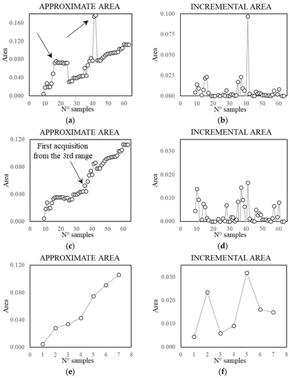 The intersection area values show a logarithmic tendency (Figure 11a). The reduction of tangent slope cannot be used directly as a criterion to define an acceptable number of samples, since it requires the a priori knowledge of the real self-area. Nonetheless, a similar trend appears in the approximate area plot and in the normalised incremental area plot (Figure 11c,d), where this latter value is equal to the area growth due to the addition of samples divided by the number of added samples. Therefore, these parameters can be used to define an acceptable number of acquisitions, which, for the specific case, is in the range 36–75. In Figure 12, Figure 13 and Figure 14, some examples of the area approximated by 36, 54, and 75 samples are reported, showing the outcome of 2 out of the 10 repetitions.