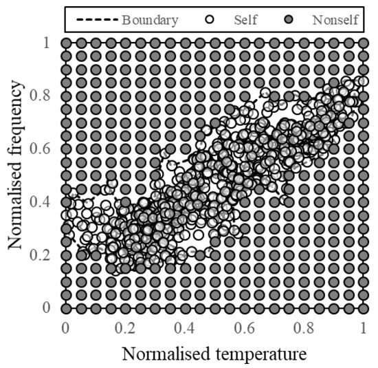 As mentioned in Section 2.4, the deterministic approximation of the self-space consists in sampling the points of the feature space belonging to the self-region and defining the area within the most shrunk boundary that envelopes them.