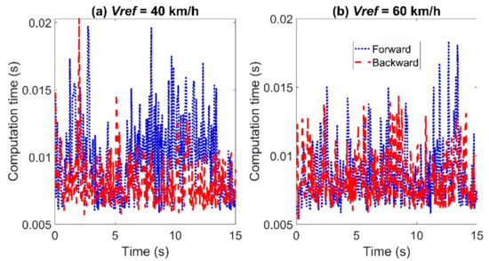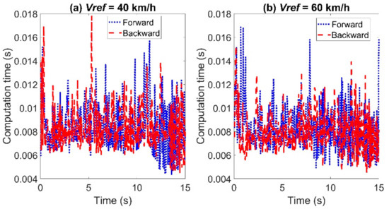 The comparison of the calculation time between the two controllers is shown in Figure 15. When the reference velocity is set to Vref = 40 km/h, the maximum calculation time using the backward Euler method was 0.0178 s, and the average calculation time was 0.0084 s, in contrast to 0.0157 s and 0.0084 s using the forward Euler method. When the reference velocity is set to Vref = 60 km/h, the maximum calculation time using the backward Euler method was 0.0152 s and the average calculation time was 0.008 s, in contrast to 0.0169 s and 0.0083 s using the forward Euler method.