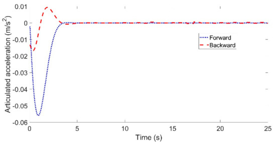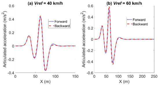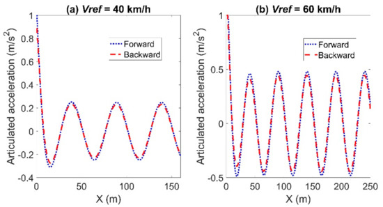 Articulated acceleration for the comparison between the forward and backward Euler method: left for Case (a) with Vref = 40 km/h and right for Case (b) with Vref = 60 km/h.