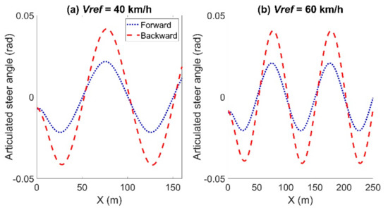 Through three sets of comparisons, we can draw some conclusions. First, the lateral tracking errors using the backward Euler method were much smaller than those when using the forward Euler method. Second, the lateral tracking errors using either the forward or backward Euler method increased with the reference velocity. Third, the calculation times using the backward Euler method were almost the same with that using the forward Euler method. Lastly, compared with the articulated acceleration, there was a clear discrepancy in the articulated steer angle.