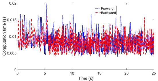 The comparison of the calculation time between the two controllers is shown in Figure 5. The calculation time of the MPC controller using the backward Euler method at each control period was almost the same or slightly larger than that of the MPC-based controller using the forward Euler method.