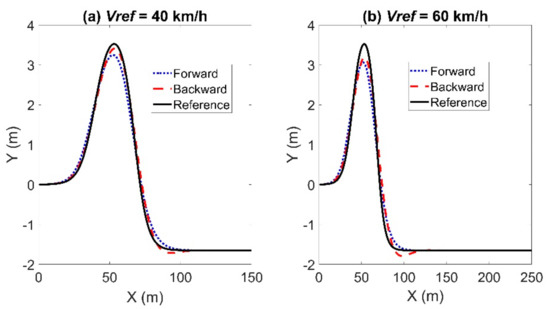 Simulation results for the double line change path: left for Case (a) with Vref = 40 km/h and right for Case (b) with Vref = 60 km/h.