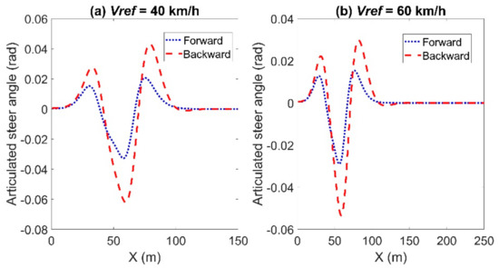 In this scenario, the vehicle was required to track a double line change path. The reference trajectory of the double line change path can be found in [33]. The tracking result of the double line change path is shown in Figure 12. When the reference velocity is set to Vref = 40 km/h, the maximum lateral and longitudinal errors using the backward Euler method were 0.3034 m and 0.0203 m, in contrast to 0.3827 m and 0.0412 m using the forward Euler method. The maximum heading errors were 0.0673 rad using the backward Euler method and 0.0648 rad using the forward Euler method. When the reference velocity is set to Vref = 60 km/h, the maximum lateral and longitudinal errors using the backward Euler method were 0.587 m and 0.0504 m, in contrast to 0.6187 m and 0.0311 m using the forward Euler method. The maximum heading errors were 0.1035 rad using the backward Euler method and 0.0967 rad using the forward Euler method. In sum, the MPC controller using the backward Euler method had a better tracking accuracy in the circular path than that using the forward Euler method. Figure 13 and Figure 14 show the articulated acceleration and steer angle, respectively.