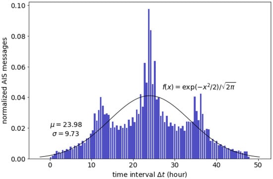Daily archived AIS messages have random time intervals ∆t between less than 1 h and up to 48 h, averaging 24-h intervals; the time-interval distribution is depicted in Figure 1. The fitted probability density function (PDF) of the overall dataset showed a standard Gaussian distribution. The data proliferated from 2010 to 2014 when satellite-based AIS became a standard practice. Although the dataset has an uneven time-interval distribution, it is considered adequate for long-term prediction because it contains years of extensive fleet data worldwide.