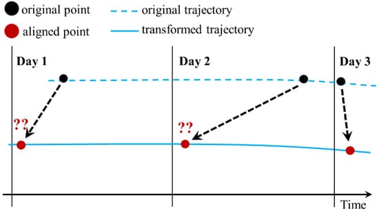 In this study, the dataset has ∆t values ranging between almost zero and 48 h (in the absence of outliers), indicating that although the dataset consists of daily AIS messages (averaging 24 h), their exact time interval can be longer than 24 h (see Figure 1). The large gap in time intervals between two consecutive AIS messages signifies that the interpolation to create an evenly spaced dataset time series would result in large errors. For instance, in a time window of 24 h, a moving ship generally has an average distance interval of more than 400 km. Consequently, interpolating the ship position in this extended time window is expected to result in a significant error in the aligned positions, thus accumulating additional errors when predicting the subsequent position. Figure 2 illustrates the uncertainty of trajectory reconstruction of the long-time-interval data. The aligned data are prone to result in a large error; therefore, any application or method that requires trajectory reconstruction is considered impractical.
