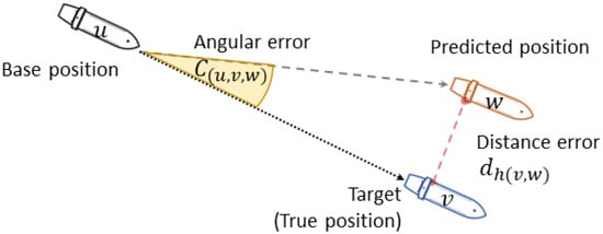 where is the base point , is the true position , and is the predicted point . The predicted position is in a vector space, and consequently, its distance error relative to the current position may not be proportional to its angular error. Figure 4 illustrates the relationship between distance and angular errors. Furthermore, the distance and angular errors can reflect the accuracy and precision of the prediction of the target, respectively.