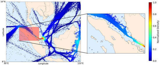 In the first experiment, a DL model was built for the Indian Ocean. The observed area is within 60° E–90° E longitude and 24° S–0° N latitude boundaries, covering 8.6 million square kilometers (calculated by geodesic area assuming the earth is a perfect sphere with a radius defined in WGS84 as 6,378,137 m). Compared to all previous studies, the boundaries were relatively larger, adequately capturing the continuous long-term movements of the vessels. Figure 5 presents the normalized density distributions of the dataset in the observed area from nine years of AIS messages involving 1531 different IMO numbers (vessels). This distribution was calculated using kernel density estimation (KDE), adopting a Gaussian kernel [45], in which the background geography was visualized using an open-source Python library Matplotlib Basemap toolkit for geospatial data processing [46].