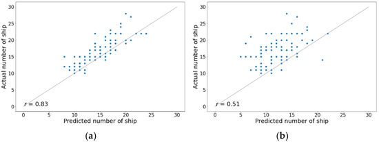 The fitted plots of the overall results from the DL models and geodesic calculations were compared to the actual data, as shown in Figure 13. The results are the daily prediction of the number of ships inside the Malacca Strait from October to December 2018. The r-value measures the linear relationship between the predictions and actual values. Compared to the actual data, a strong relationship with the r-value of 0.83 from the DL model confirms that predictions with an average time interval of 24 h using deep learning are possible, which is contrary to the belief that the motion-based method is not effective for long-term vessel location prediction. By using proper DL systems and massive data, this result confirms that an accurate long-term prediction of the vessel position can be generated with the straightforward motion-based method. In contrast, the geodesic calculation showed a weak relationship with an r-value of 0.51, suggesting that conventional calculations cannot be used for the long-term position projection of a vessel moving in congested waters or near the ports.