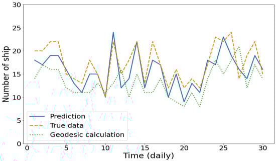 Moreover, Figure 14 shows the daily prediction of the number of ships inside the sample location for the entire month of November 2018. The estimated target values from the DL model and geodesic calculations were compared to the ground truth target values. The DL model proved that it can accurately predict the quantity inside the location for an entire day without additional information regarding historical navigational status. Meanwhile, as the geodesic calculation failed to predict the long-term position of a vessel moving in congested waters or near the ports, it also failed to predict the number of ships.