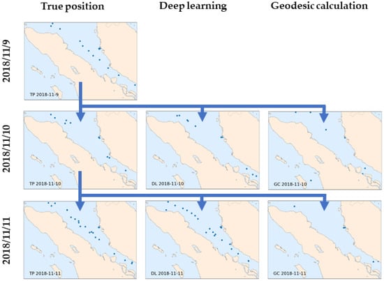 Detailed ship position predictions inside the sample location are shown in Figure 15. The ship position prediction from the DL model and geodesic calculation in the Malacca Strait was compared with the actual position on 10 and 11 November 2018. In this location, most ships were moving, and some were idle near Malaysia’s Teluk Rubiah port. Examining the actual data on 9 November, there was a line of ships moving from the northwest to the southwest, three of which were separated at the rear. These three ships moved to the southwest the next day, and another line of ships appeared from the northwest, which eventually was the start of a congested line of moving ships that appeared on the 11th. The DL model closely mimicked the position of these ships and the movement of the ground truth targets on 10 and 11 November, even for ships idling at the port. The number of ships and their positions were reliably predicted by the model. From these results, the dl model appears to have a sense of the dimension of the geographic coordinate system that can be or is often passed. In contrast, geodesic calculation failed to predict the position of the ships either in the moving position or idle near ports, and also resulted in a poor estimate of the number of ships inside the area.