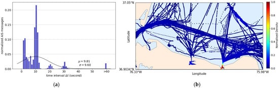 A small dataset with short-time intervals near the ports was used to further analyze the robustness of the end-to-end DL models. The dataset was retrieved from the ATD2019 challenge dataset (https://gitlab.com/algorithms-for-threat-detection/2019/atd2019; accessed date 19 September 2021). All AIS training and challenge data with different properties were combined and used to construct a dataset with varying time-interval distribution. Figure 16a shows the short-time-interval distribution of the small dataset averaging around 10 s intervals. Most of the data have near-real-time intervals, and the rest vary up to 60 s. The dataset consisted of ships movements near ports located around north of Norfolk, Virginia, North America (see Figure 16b). In this dataset, course over ground is given but not heading , and therefore, to accommodate the same 10 input features as the previous experiments, the heading was copied from the course over ground.