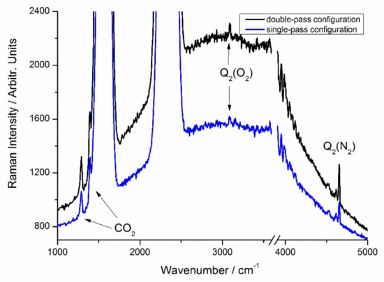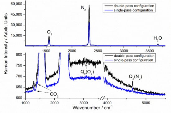 For the double pass configuration, the spectrum of ambient air is shown in Figure 2 and Figure 3. For these experiments, the laser output power was set to 1.5 W. The spectrum of ambient air is dominated by the spectral features of oxygen (O2) at 735.5 nm (1555.2 cm−1), nitrogen (N2) at 779.9 nm (2329.9 cm−1) and water molecules (H2O) at 869.9 nm (3656.2 cm−1). Besides major components, the spectral features of Q2 (N2) branch at 952.8 nm (4656.0 cm−1) and CO2 at 721.1 nm (1283.6 cm−1) and 726.6 nm (1388.7 cm−1) can also be unequivocally assigned with 1 s integration time (Figure 2, bottom), though the contrast of the higher wavenumber peak of the CO2 Fermi resonance pair has been degraded by the Q1 (O2) branch. The signature of Q2 (O2) branch at 828.9 nm (3087.6 cm−1) is almost noise-limited with 1 s integration time but is detectable with 10 s integration time, as shown in Figure 3. The above results clearly demonstrate the high sensitivity achieved in this Raman setup, considering that the intensity of Q2 (O2) branch is approximately 3000 times less than Q1 (O2) branch. The LODs are estimated using procedures described in detail in a previous publication and is associated with a signal-to-noise ratio (SNR) of 3 [29]. In the current work, noise is calculated using flat regions between 5400 to 5700 cm−1. For N2 and O2 (assuming 78% and 21% composition in the air) with 1 s integration time, the noise (σ) is extracted as 1.96. The estimated noise equivalent detection limits (3σ) are 7.6 Pa and 8.4 Pa for N2 and O2, respectively, which corresponds to relative abundance by volume at 1 bar total pressure of 76 ppm and 84 ppm. From the humidity data logger reading of 55% RH (corresponding to approximately 1265 Pa of water vapor in the air), a LOD of 2.8 Pa is deduced for H2O, which corresponds to relative abundance by volume at 1 bar total pressure of 28 ppm. Recently, Godot et al. have introduced a commercial Raman analyzer for process control in a tritium facility, and the LOD was reported as 200 Pa for hydrogen isotopologues, with an acquisition time of 120 s [32]. Based on our previous investigations [29,30,31], the LOD of the current setup for hydrogen isotopologues can be safely estimated to be lower than that of H2O. Thus, the current system is preferred in low-pressure gas applications. In recent year, FERS has shown excellent sensitivity for multigas analysis. Hanf et al. showed that LODs of 9 ppm and 8 ppm could be achieved for N2 and O2 [33]. For H2S, LOD as low as 33 ppm was also demonstrated [20]. Besides, small samples volumes are needed in this technique, which is critical for certain applications where amount of gas sample is limited. However, the small core diameter hampers the quick exchange of gas samples, and this technique is not suitable for in-line low-pressure gas detection and monitoring.