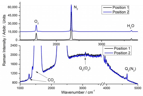 For the two-channel detection system, the spectra of ambient air recorded with laser output set to be 1.5 W is shown in Figure 4. The spectra of ambient air (Figure 4, top) recorded in positions 1 and 2 are nearly indistinguishable by visual inspection. The small difference in signal strength is due to slightly different alignments. With 10 s integration time, the peaks of Q2 (N2) and CO2 are readily identified, and the peak of Q2 (O2) is also distinguishable (Figure 4, bottom). Thus, similar high-sensitivity is also achieved in a two-channel detection system. At position 1 with 1 s integration time, experiments with ambient air show that the noise equivalent detection limit (3σ) of 8.0 Pa (N2), 8.9 Pa (O2) and 3.0 Pa (H2O) can be achieved, which corresponds to relative abundance by volume at 1 bar total pressure of 80 ppm, 89 ppm and 30 ppm. The LODs calculated at position 2 are almost identical to values obtained with position 1. The estimated LODs are slightly higher than the above (double-pass configuration) single-channel detection system, which is reasonable since the laser energy loss is higher in a two-channel detection system.