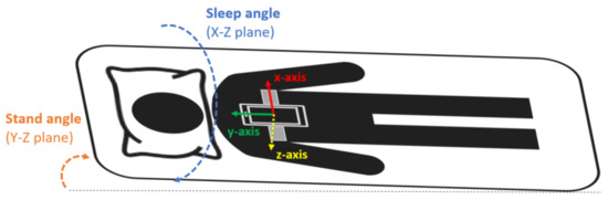 Smartphone placement attached to the subject’s thorax with an elastic band. The orientation of the smartphone accelerometer’s axes and the sleep and stand angles are also indicated.