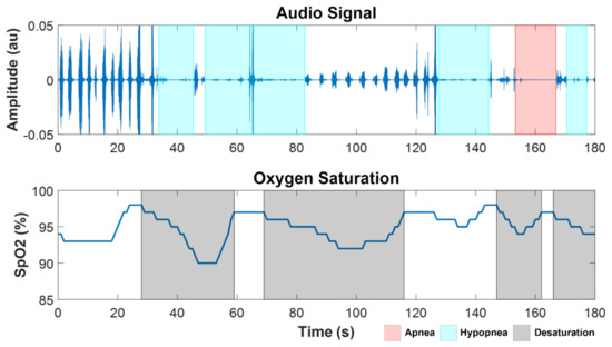 Example of a segment of audio and SpO2 signals from a SCI patient with severe OSA (SCI 4, AHI = 60 h−1), showing apnea (red), hypopnea (cyan), and desaturation (black) events.