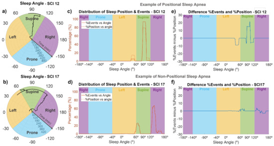 Sleep angle and association between the sleep position and apnea/hypopnea events for two representative SCI patients. The first column (a,b) are polar plots indicating the sleep angle as a function of time, the middle column (c,d) shows the percentage of time spent at each sleep angle (dashed line), and the percentage of events occurring during each angle (solid line), and the last column (e,f) shows the difference between the percentage of time and percentage of events at each sleep angle. SCI 12 (upper panels) is an example of a patient with positional sleep apnea, with an increased frequency of events in supine position, while SCI 17 (lower panels) is an example of a patient with non-positional sleep apnea.