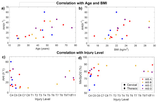 Correlation of AHI with age (a), BMI (b), and injury level (c), and correlation of minimum SpO2 with injury level (d) for the SCI participants. Colors indicate the injury completeness (AIS level). Circles and diamonds indicate patients with cervical and thoracic injuries, respectively.