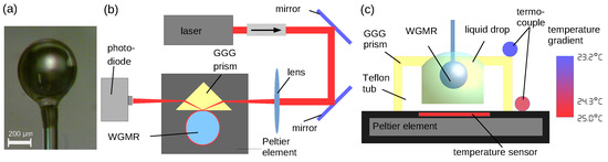 The scheme of the experimental system. (a) Silica microsphere whispering gallery mode resonator (WGMR) with a diameter of (509 ± 3) m. (b) View from the top with a Gadolinium Gallium Garnet (GGG) coupling prism to excite the resonance of whispering gallery mode resonator (WGMR) using a 780 nm external cavity diode laser (ECDL), a Peltier element to control temperature, and a photodiode to process the signal transmitted in the air. (c) Side view where a Teflon tub is viable to contain the liquid drop, which can be situated above the rim because of liquid tension forces.