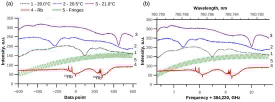 WGMR was coupled to a prism, as described in reference [24]. While sweeping the laser frequency by changing the grating angle/position, transmittance spectra spanning about 3–4 GHz were recorded. Two reference signals were used for calibration: Rb saturation spectroscopy signal and interferometer fringes from the optical fiber, which has flat ends. The laser was adjusted in a mode to measure both Rb D2 and Rb D2 lines in the scanning region (see Figure 2a, curve 4). The hyperfine structure consisted of 3 Rb lines with known frequencies and 3 cross-over peaks for each isotope D2 line. The first reference was used to calculate the interferometer period of 48.78 MHz for the second reference, to follow the laser frequency drift due to change of ambient room conditions, and to indicate the absolute frequency. While observing the reference signal obtained from fringes, we deduced that the laser frequency scanning was nonlinear (see Figure 2a, curve 5), and additional calibration of the laser scan frequency was necessary (see Figure 2b). The second reference was used to both monitor the laser scan mode and linearize the frequency scanning.