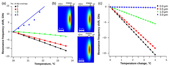 The modeling results are shown in Figure 4b,c and Table 2. When the thickness of PMMA coating was increased, the electromagnetic field concentrated in the fundamental mode shifted from being located in silica resonator (0.5 m coating) to being in the PMMA coating layer (3.0 m coating). Similarly to experimental results, the temperature sensitivity decreased with increasing the thickness (Figure 4c).