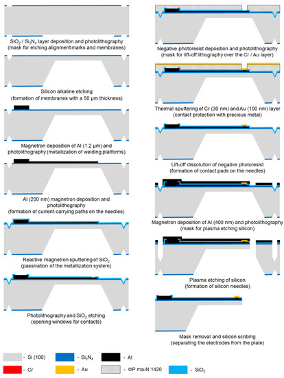 A multi-electrode array was created using photomasks for contact photolithography when creating a system of multilevel metallization, passivation, and shaping needles. Multilevel metallization was carried out by the thermal deposition of films of aluminum 1200 nm and 200 nm thick, chromium (30 nm), gold (100 nm). Lift-off photolithography was performed on these films using a negative photoresist ma-N 1420. Silicon oxides of 200–300 nm thick, deposited by reactive magnetron sputtering, were used as the dielectric. The needles of the multi-electrode array are formed by vertical plasma etching of silicon (RIE); the formation of a plasma-resistant mask was realized on a layer of aluminum with a thickness of 400 nm. Individual electrodes were prepared after wet removal of the mask and diamond disc-cutting of the wafer. The electrodes were mounted on the board by welding with gold conductors using ultrasonic welding technology. The complete technological route for the manufacture of electrodes is shown in Figure 2.