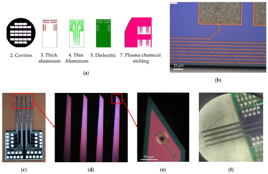 The multilevel metallization system was implemented as follows: Al (1200 nm) → Al (200 nm) → Cr (30 nm) → Au (100 nm). Individual elements are shown in Figure 4b. The first layer of aluminum on the welding pads has a thickness of 1.2 µm. Elements of 300 × 300 and 300 × 600 µm in size were formed from this for the subsequent ultrasonic welding of wires at the stage of mounting electrodes (Figure 4b, matte gray color). The second layer of aluminum was 200 nm thick. From this, current-carrying paths were attached to the contact pads located on the tips of the needles (Figure 4b, light brown). The width of the tracks was 10 µm; the minimum distance between them was 15 µm. The entire surface of the aluminum metallization was covered with a protective dielectric layer, except for the points of contact with brain neurons and areas for welding wires. Reactively deposited silicon oxide with a thickness of 200–300 nm was used as a dielectric.