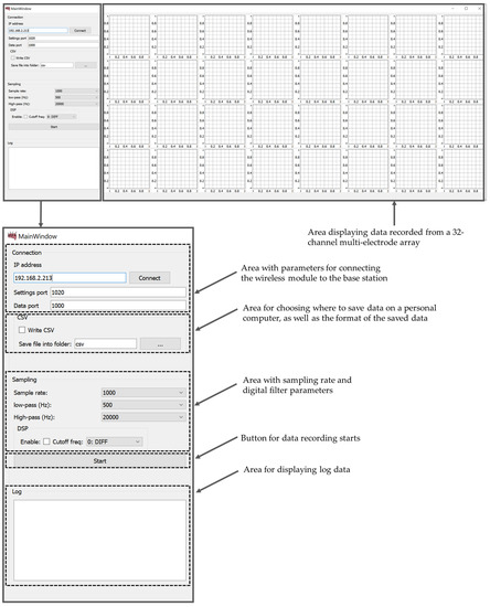 The software part (MouseBrainView, 0.2.3, Saint Petersburg, Russia) of the PC is implemented to visualize the signals of 32 measurement channels in real-time and record the information in a CSV file. The main function of data visualization and recording software (current software) is to configure the wireless wearable module and exchange data with it via a local network. The software processes 32 data channels from multi-electrode array, displays the data received from each channel in the form of graphs and records them in a CSV file for further analysis. The software GUI provides the ability to adjust the sampling rate and digital filter parameters for data preprocessing. It can be compiled with a cross-platform bytecode that runs on Windows, Mac OS and Linux. The graphical user interface of the MouseBrainView program is shown in the Figure 10.