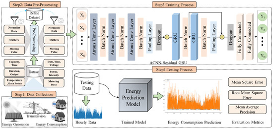 19]. Therefore, this study aimed to use a hybrid DL approach based on ACL and RGRU to enhance short-term horizons for both energy consumption and generation predictions. Our novel hybrid framework is beneficial for efficient energy management systems. The proposed network extracts discriminative and representative features from sequential data via ACL and forwards it to the RGRU that learns spatial patterns from sequence. Our main contributions in this study are as follows: